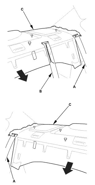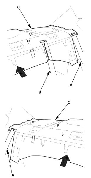 5. Pull out both rear seat belts (A) and the rear center seat belt (B) through the slits in the rear shelf trim (C), then remove the rear shelf trim.