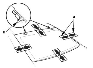 7. Set the rear window in the opening, and center it. Make alignment marks (A) across the rear window and the body with a grease pencil at the four points shown: