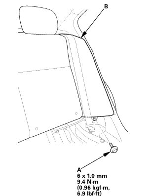 1. Remove the bolt (A) securing the rear seat side bolster (B).