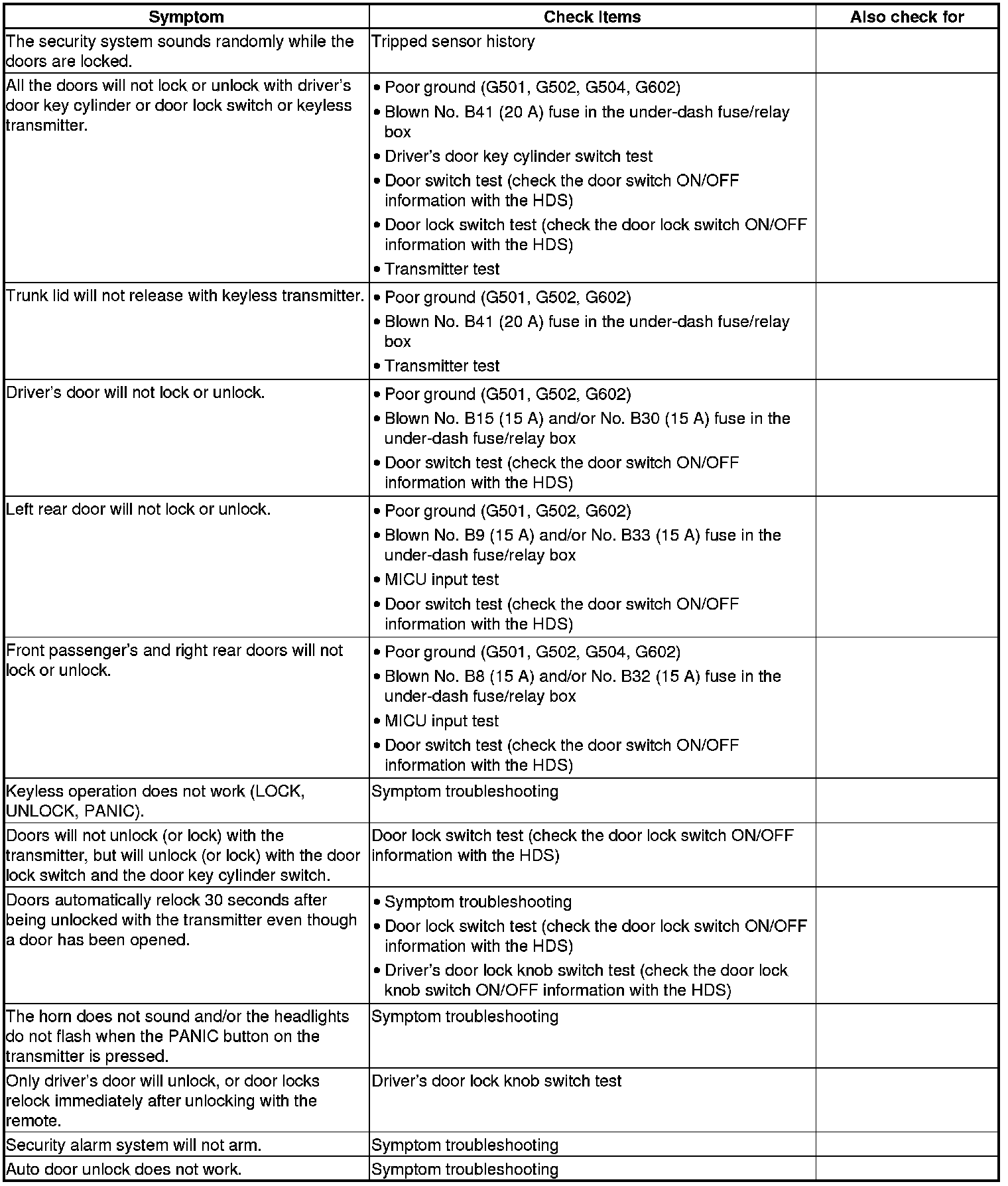 Keyless/Power Door Locks/Security System Symptom Troubleshooting Index