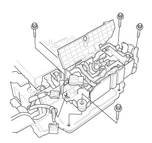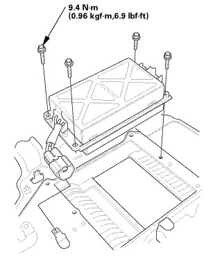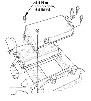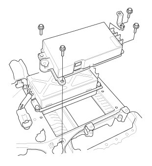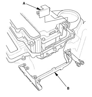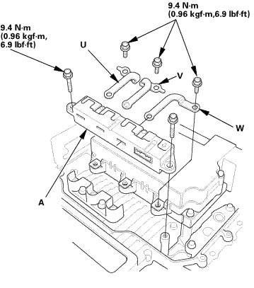 9. Remove the phase motor current sensor (A) and the bus bars (U, V, W).