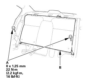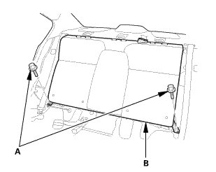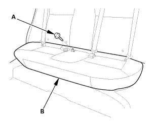 1. Remove the bolt (A) securing the rear seat cushion (B).