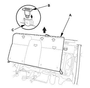 4. Lift up the rear seat-back (A) to release the seat legator hooks (B) from the brackets (C) on the body, then remove the seat-back.