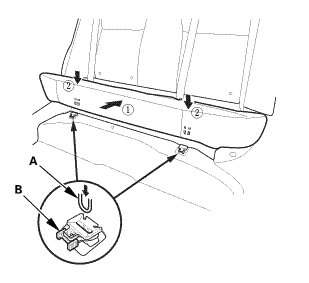 1. Install the hooks (A) in the rear seat cushion clips (B).