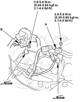 3. Install the bolt (A) securing the rear seat side bolster (B).