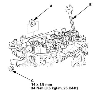 2. Hold the camshaft with a 27 mm open-end wrench (B), then tighten the bolt (C).
