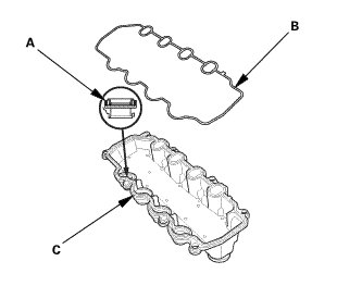 3. Install the head cover gasket in the groove of the cylinder head cover (C).