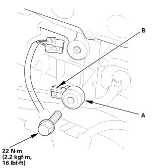NOTE: When installing the knock sensor, make sure the direction of the sensor connector (B) is as shown.