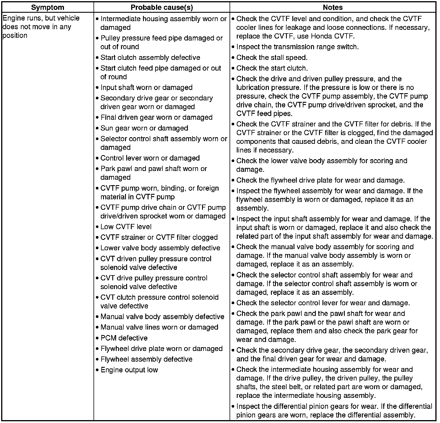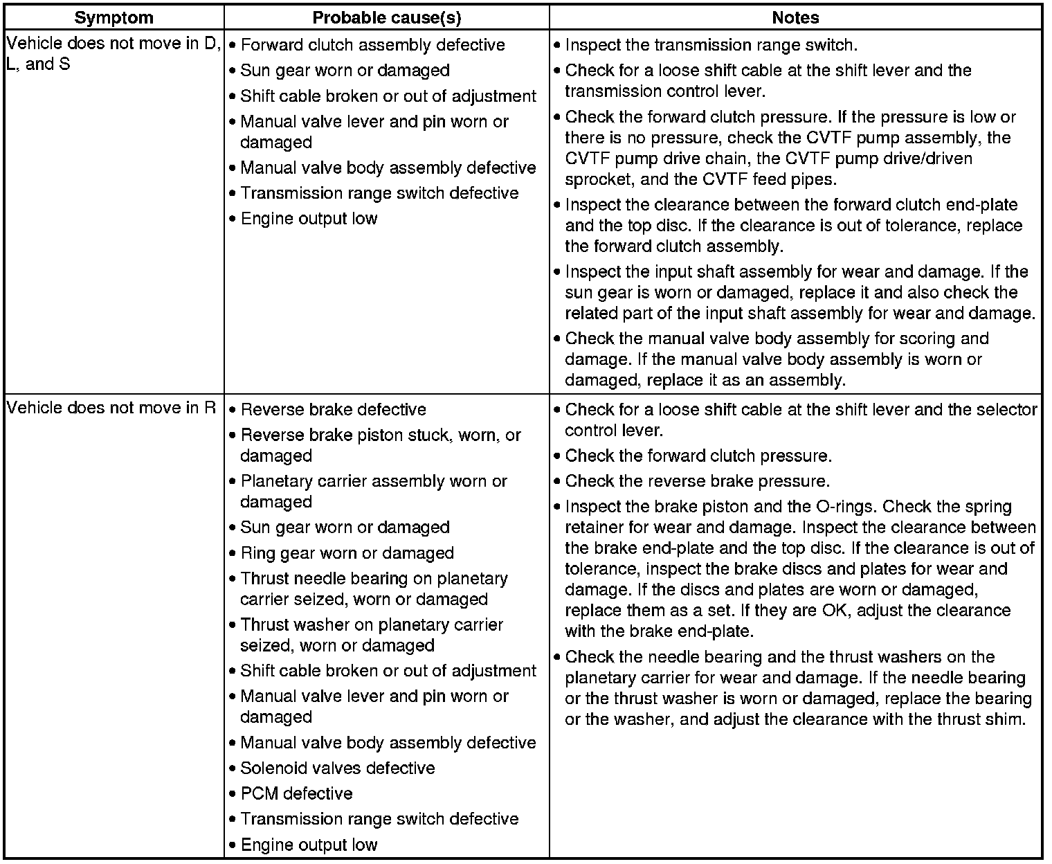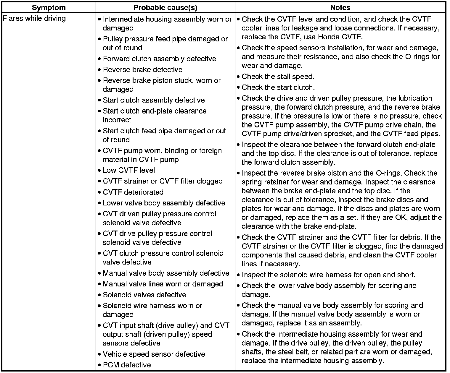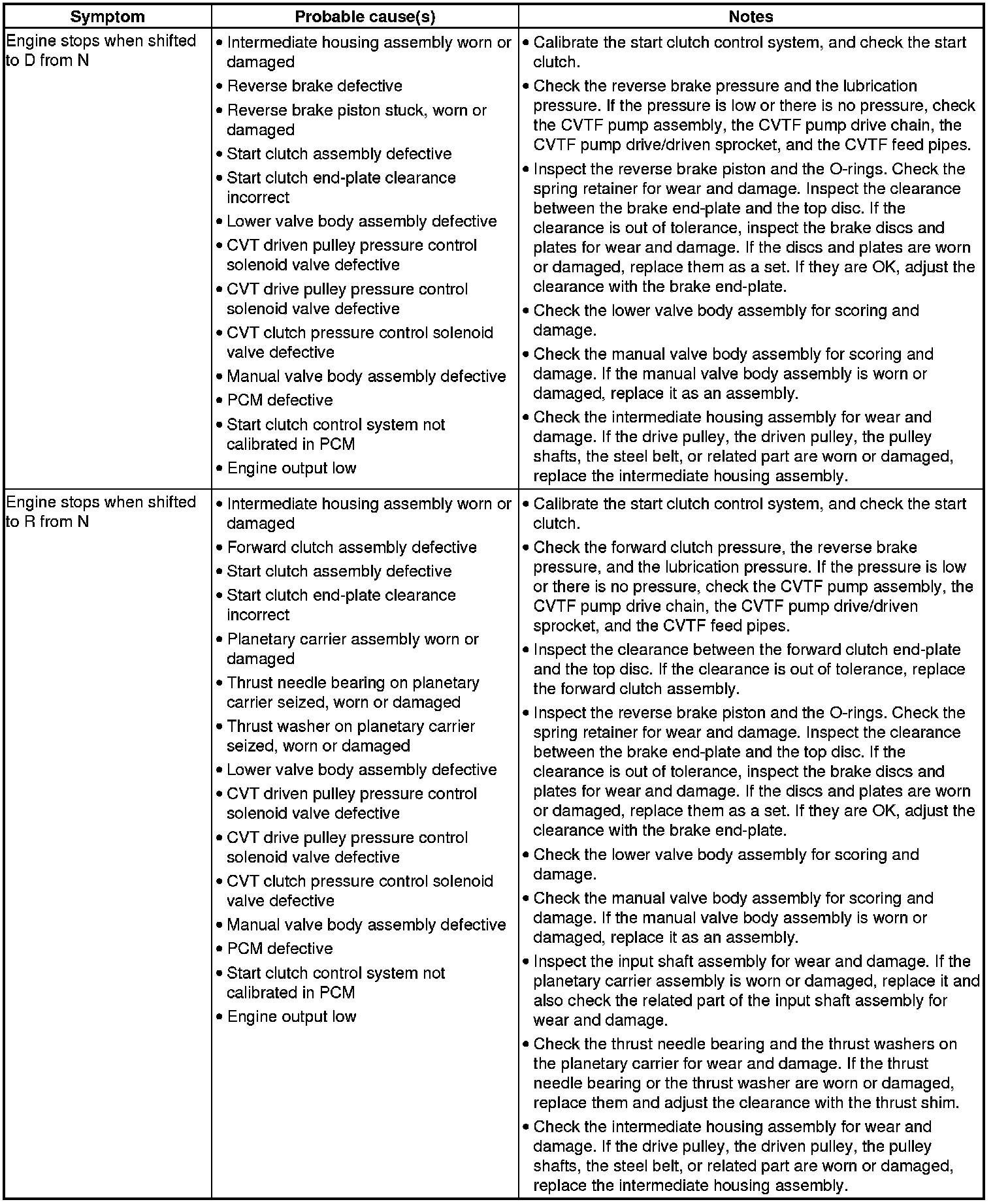 CVT System Symptom Troubleshooting Index