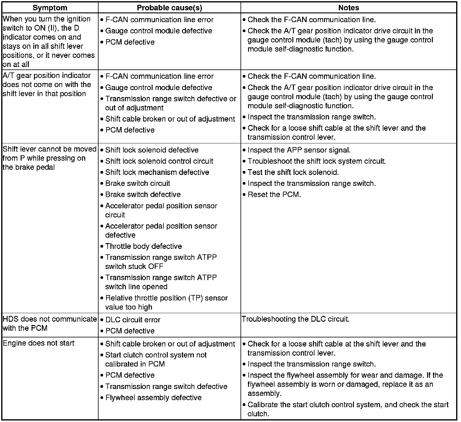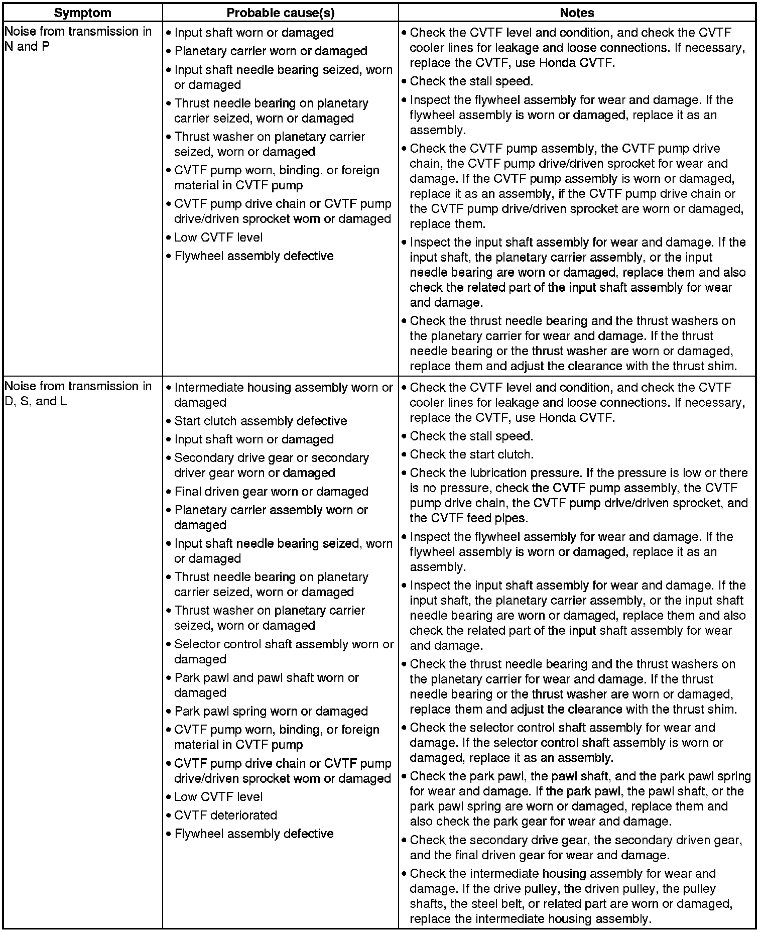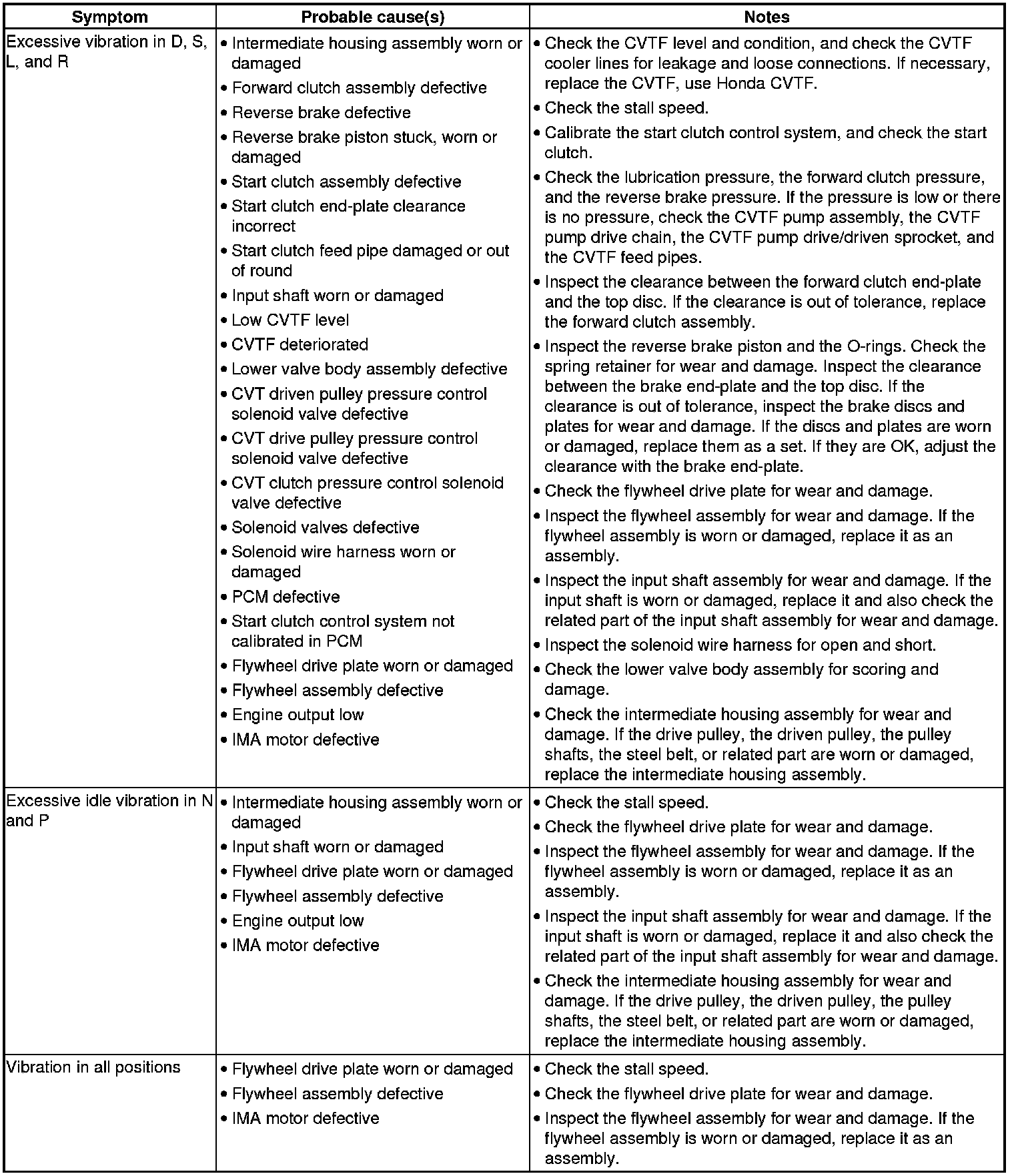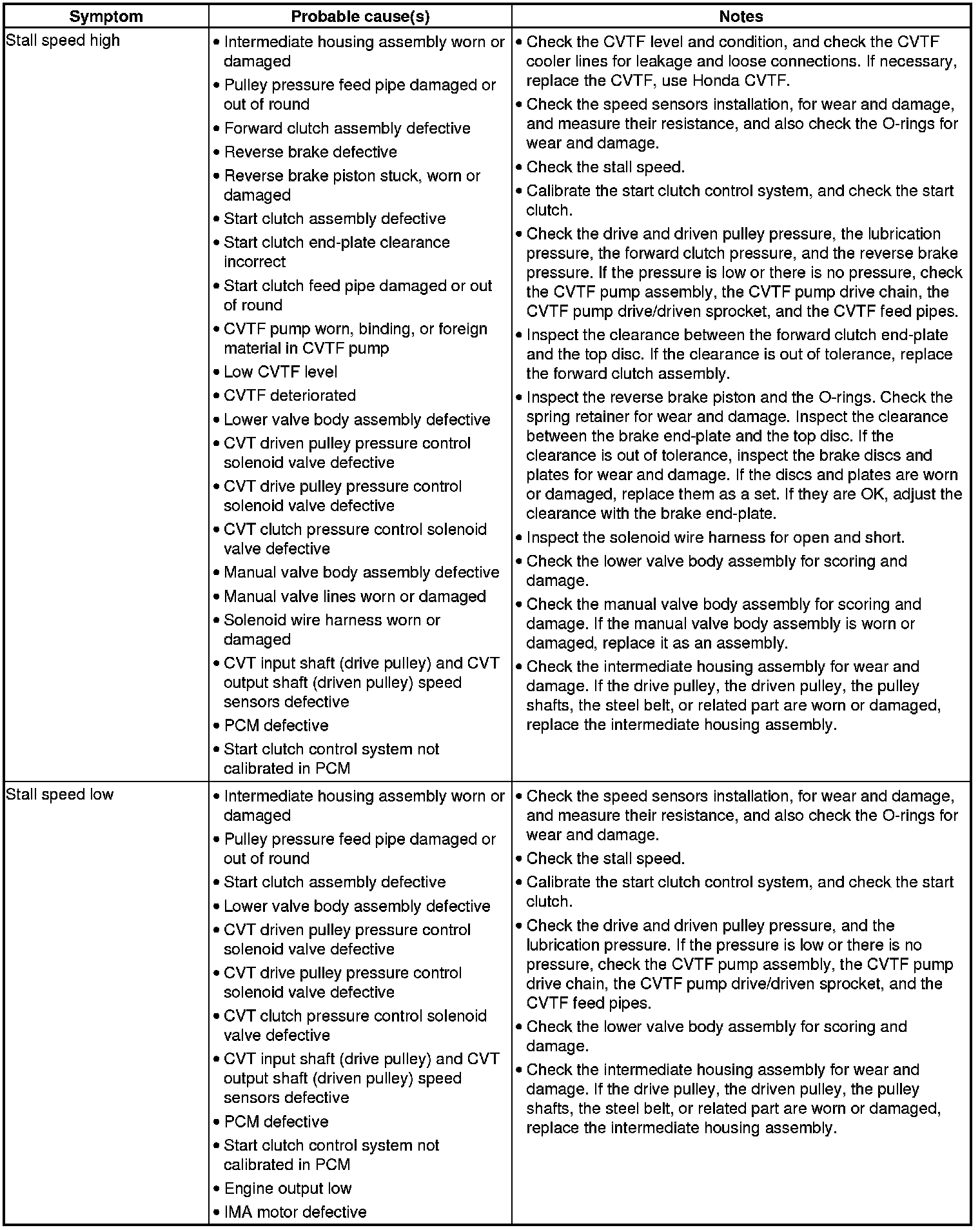 CVT System Symptom Troubleshooting Index