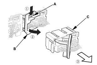 To release the lock (A), pull the lever (B) while pushing the lock on the outside of the connector, then pull out the connector (C).