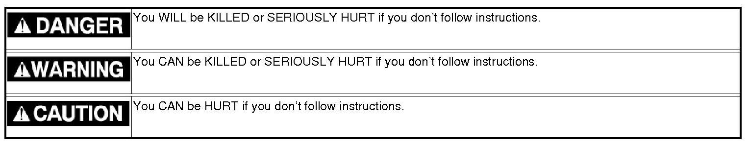 * Safety Messages - preceded by a safety alert symbol and one of three signal words, DANGER, WARNING, or CAUTION. These signal words mean: