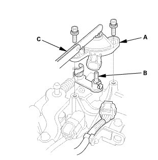 3. Install the transmission range switch (A) gently on the selector control shaft (B) while holding it in the N position with the 2.0 mm (0.079 in) feeler gauge blade (C).