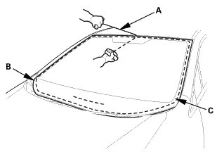 7. Apply a light coat of glass primer along the edge of the windshield (A) between the rubber dam (B) or the windshield moldings (C) as shown, then lightly wipe it off with gauze or cheesecloth: