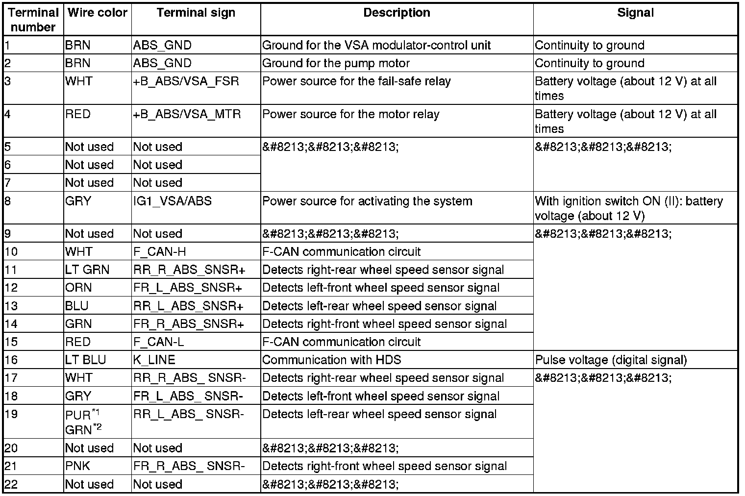 VSA Modulator-Control Unit Inputs and Outputs for 22P Connector (Connector Disconnected)