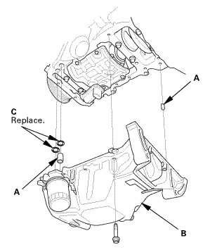 5. Install the oil pan (B) with new O-rings (C).