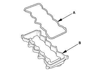 2. Install the head cover gasket (A) in the groove of the cylinder head cover (B).