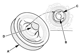 3. Install the crankshaft pulley (A) onto the crankshaft (B) by aligning the flat sides (C) of the pulley with the flat sides (D) of the inner oil pump gear.