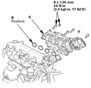 1. Install the intake manifold and throttle body assembly (A) with new gaskets (B).