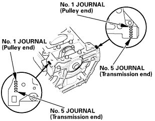1. Numbers, letters, or bars have been stamped on either side of the lower block end as a code for the size of each of the five main journal bores. Write down the block bore codes. If you cannot read the codes because of accumulated dirt and dust, do not scrub them with a wire brush or scraper. Clean them only with solvent or detergent.