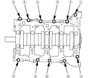 2. Remove the bearing cap bolts. To prevent warpage, loosen the bolts in sequence 1/3 turn at a time; repeat the sequence until all bolts are loosened.