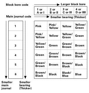 4. Use the big end bore codes and the rod journal codes to select appropriate replacement bearings from the following table.