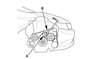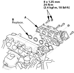 1. Install the intake manifold assembly (A) with new gaskets (B).