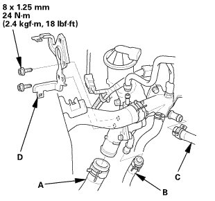 1. Connect the lower radiator hose (A), the water bypass hose (B), and the heater hose (C).