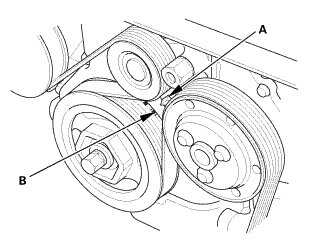 3. Insert the feeler gauge (A) between the adjusting screw (B) and the end of the valve stem on the No. 1 cylinder, and slide it back and forth; you should feel a slight amount of drag.