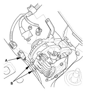 2. Check for oil leaks from the drive belt auto-tensioner damper (B) and check for damage to the damper rubber.