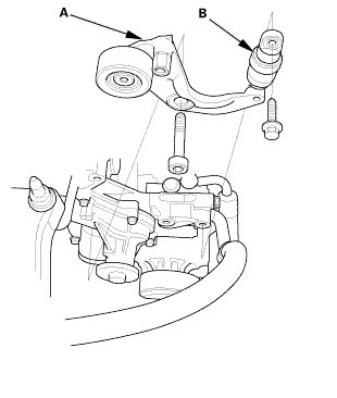 1. Move the auto-tensioner (A) counterclockwise to relieve tension from the drive belt (B).