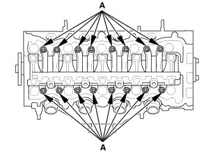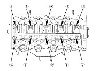 1. Remove the cylinder head bolts. To prevent warpage, loosen the bolts in sequence, 1/3 turn at a time, repeat the sequence until all bolts are loosened.