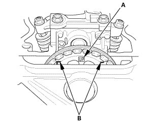1. Set the No. 1 piston at top dead center (TDC). The "UP" mark (A) on the camshaft sprocket should be at the top, and the TDC grooves (B) on the camshaft sprocket should line up with the top edge of the head.