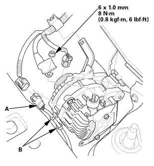 3. Install the harness connector (A) and the harness clamps (B).