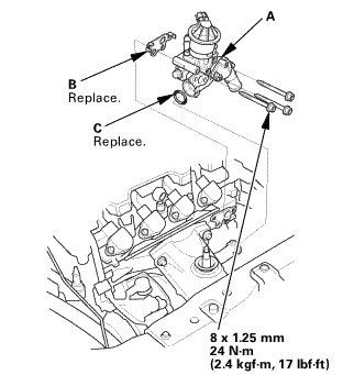 1. Install the thermostat housing (A), using a new gasket (B) and new O-ring (C).