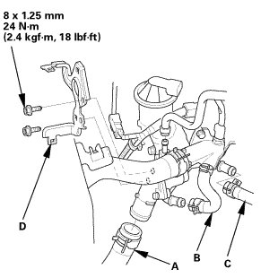 1. Connect the lower radiator hose (A), the water bypass hose (B), and the heater hose (C).