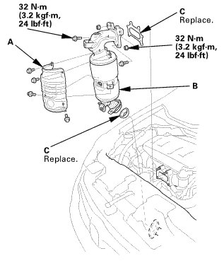 2. Install the catalytic converter (B) with new gaskets (C).