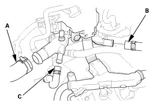 1. Connect the upper radiator hose (A), the heater hose (B), and the water bypass hose (C).