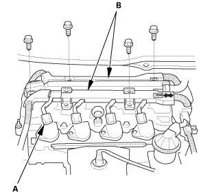 1. Remove the cam chain guide (A) and the cam chain tensioner arm (B).