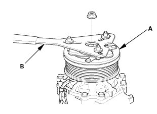 1. Remove the center nut while holding the armature plate (A) with the A/C clutch holder (B).