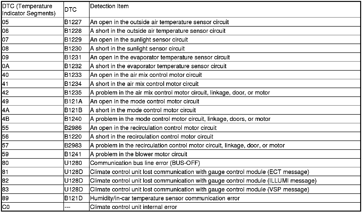 NOTE: If temperature indicator segments 05, 07, 09, and 89 indicator are on at the some time, there may be an open in the sensor common ground wire.