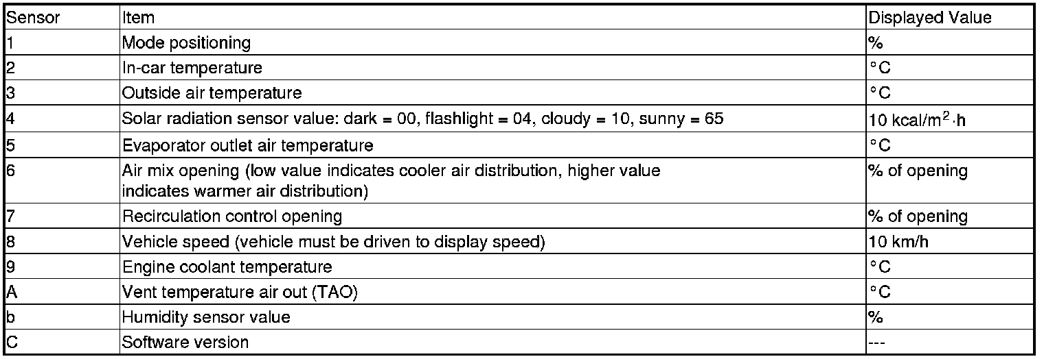 The climate control unit has a mode that displays the sensor inputs it receives. This mode shows you what the climate control unit is receiving from each of the sensors, one at a time, and it can help you determine if a sensor is faulty.