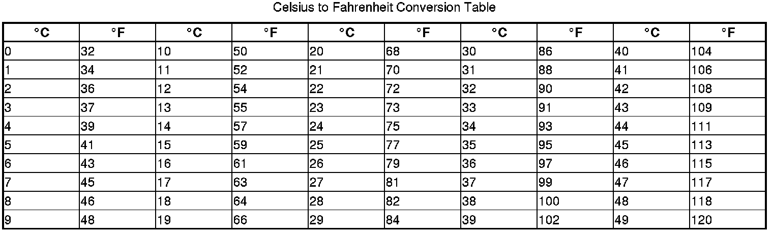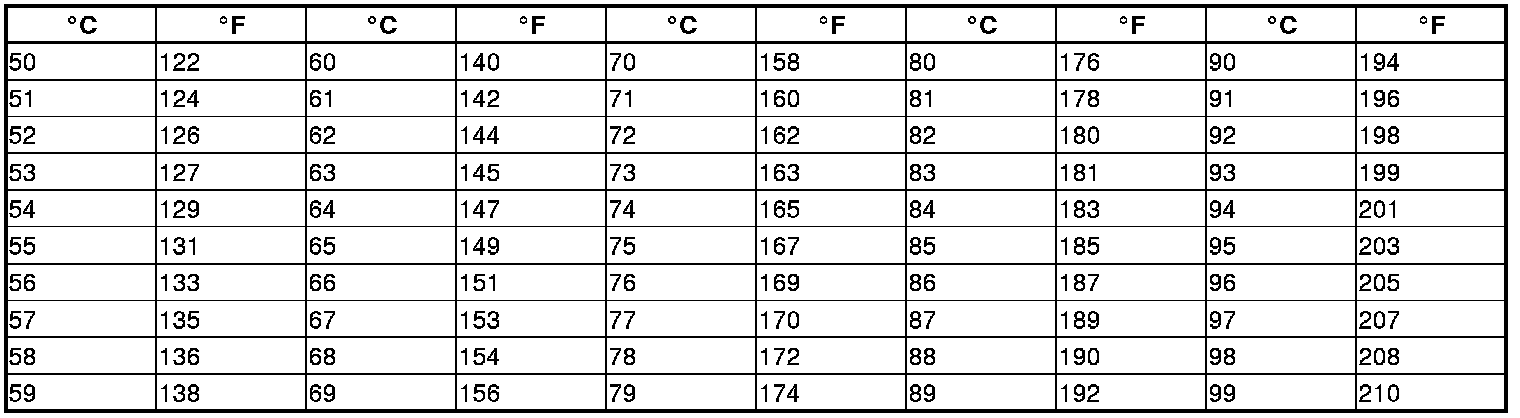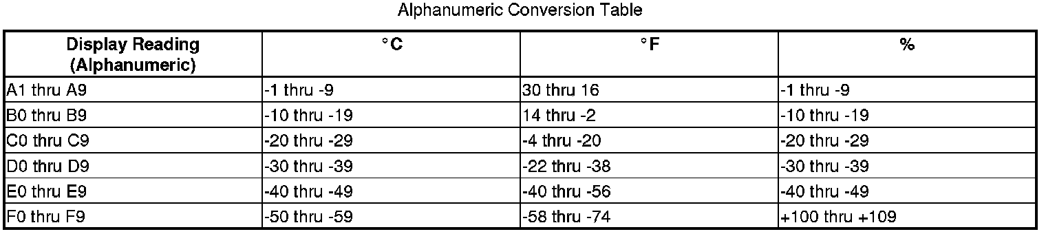 * The sensor values will be displayed in degrees Celsius (°C) or an alphanumeric code. Use the chart to convert the value to degrees Fahrenheit (°F).