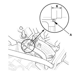 2. Check the position of the auto-tensioner indicator pointer (A) is within the standard range (B) as shown. If it is out of the standard range, replace the drive belt.
