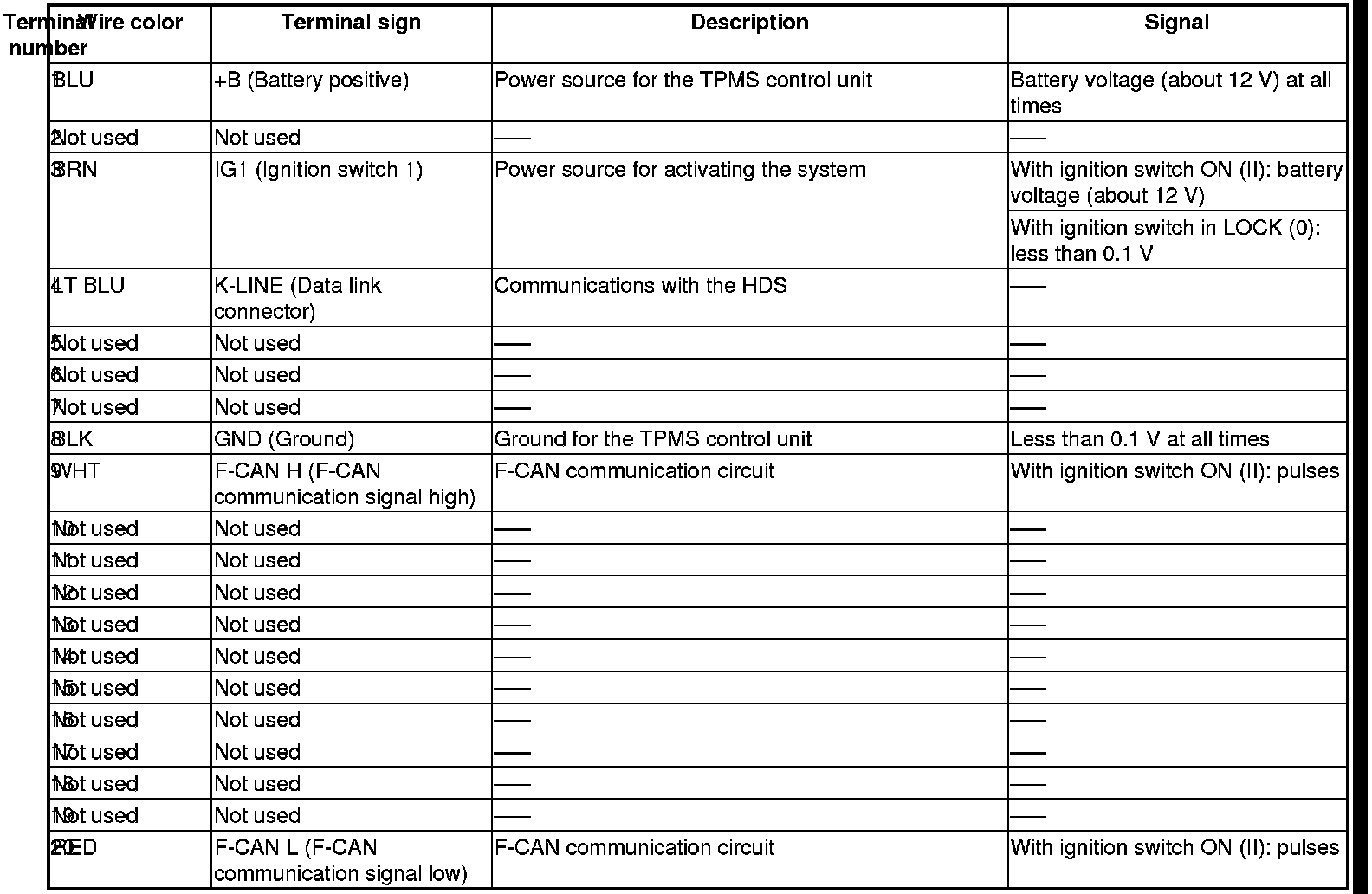 TPMS Control Unit Inputs and Outputs for 20P Connector