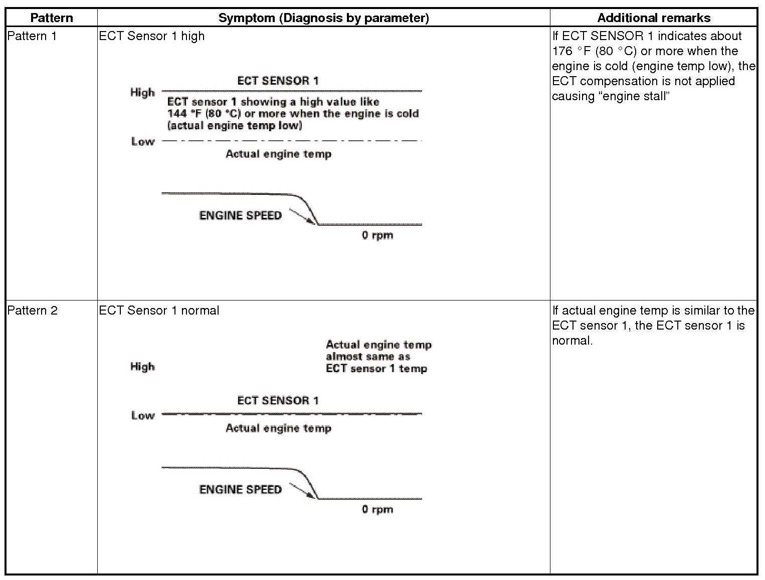 -Pattern 1- Check for a short in ECT sensor 1 circuit and failure in ECT sensor 1.