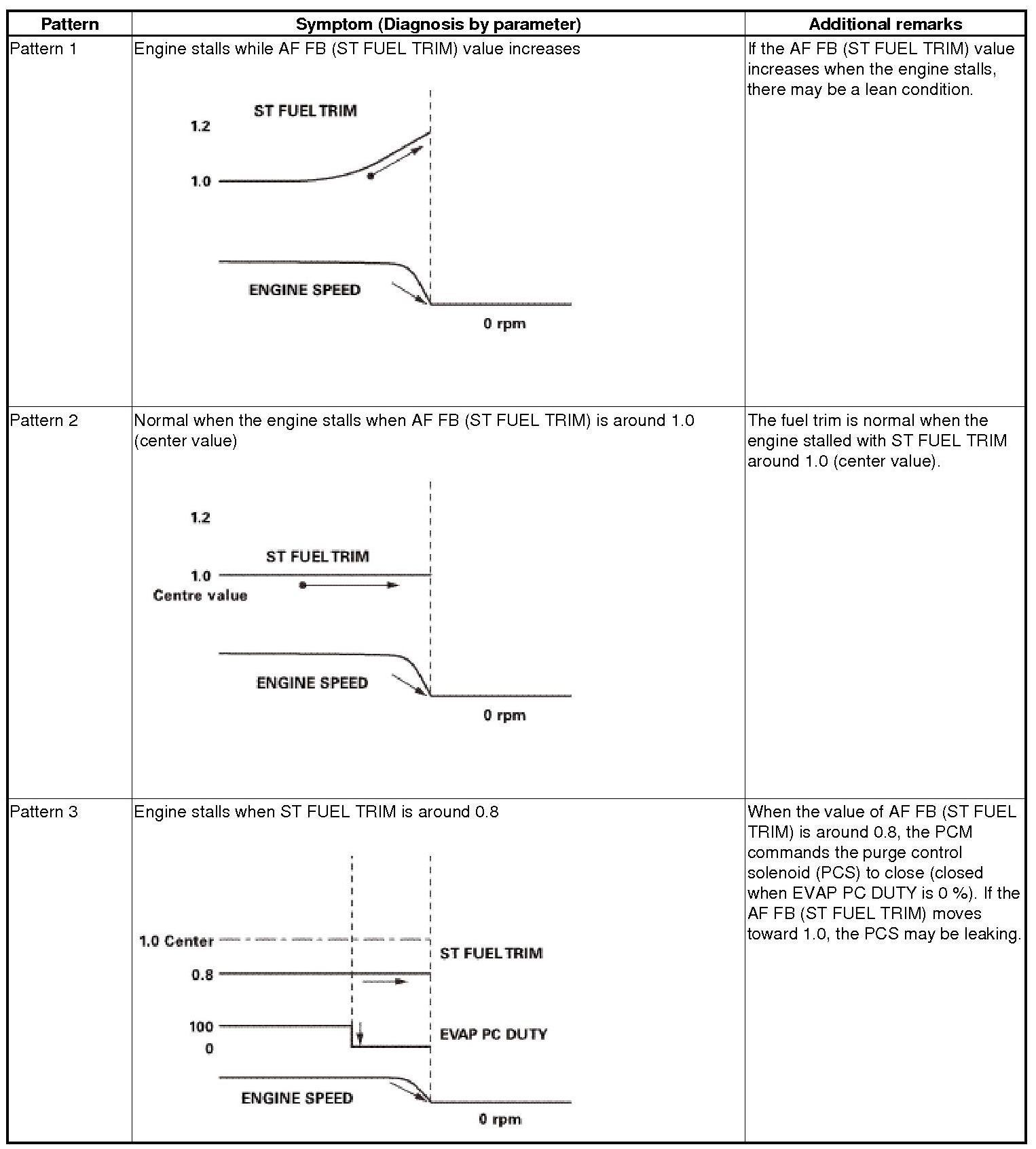 Check the recorded snapshot parameters of the engine stall 2, then compare the AF FB (ST FUEL TRIM) pattern from the charts, and determine the problem.