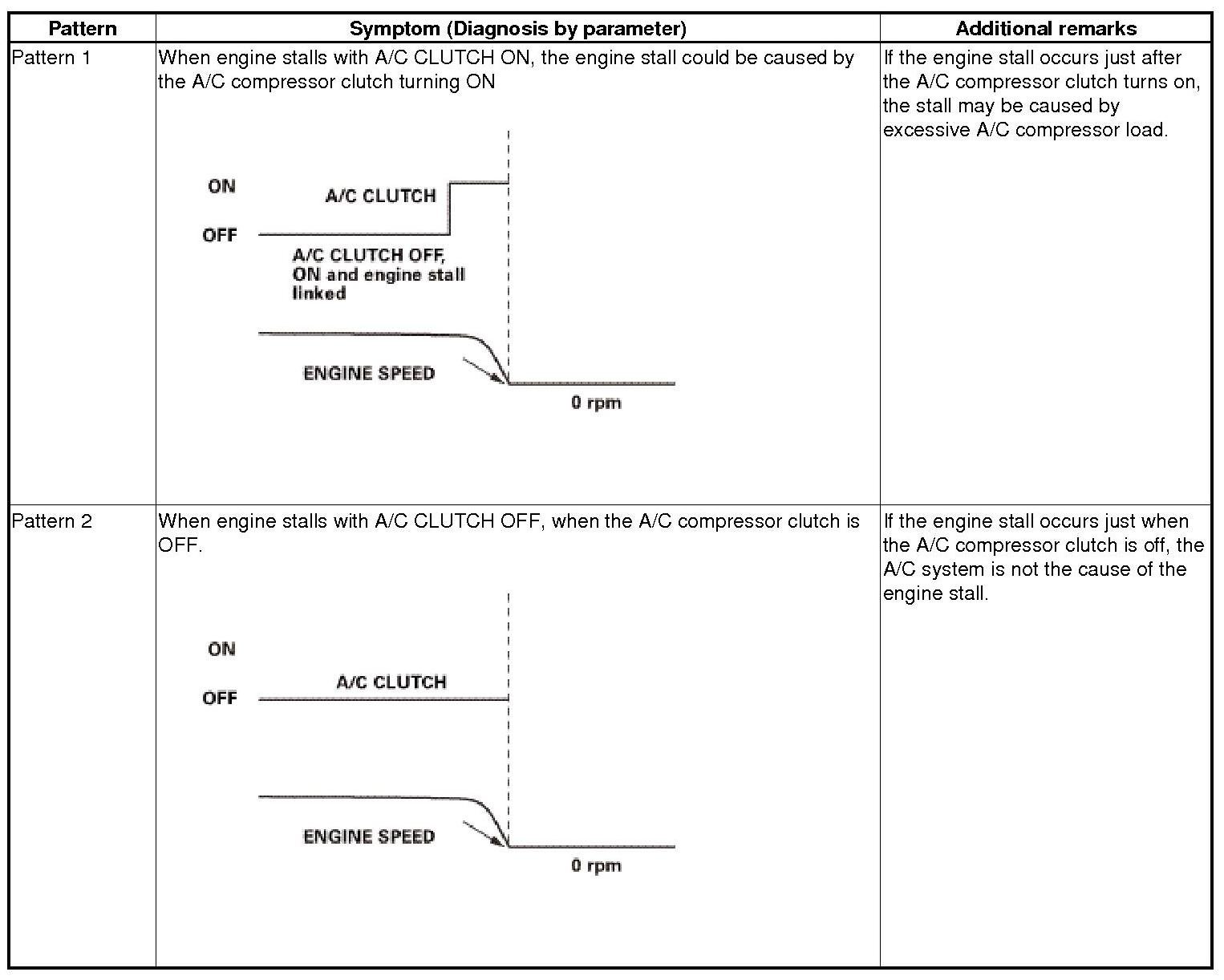 Check the recorded snapshot parameters of the engine stall 2, then compare the A/C CLUTCH pattern from the charts, and determine the problem.