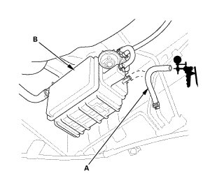 -1. Disconnect the vacuum hose (A) from the EVAP canister (B), and connect a vacuum pump/gauge, 0-30 inHg, to the hose.