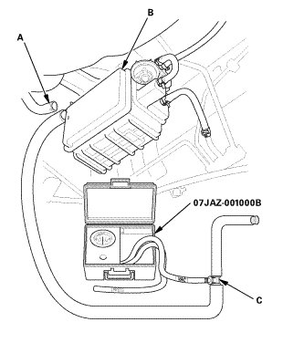 -4. Disconnect the purge air hose (A) from the EVAP canister (B), then connect a T-fitting (C) and a vacuum gauge to the hose as shown.